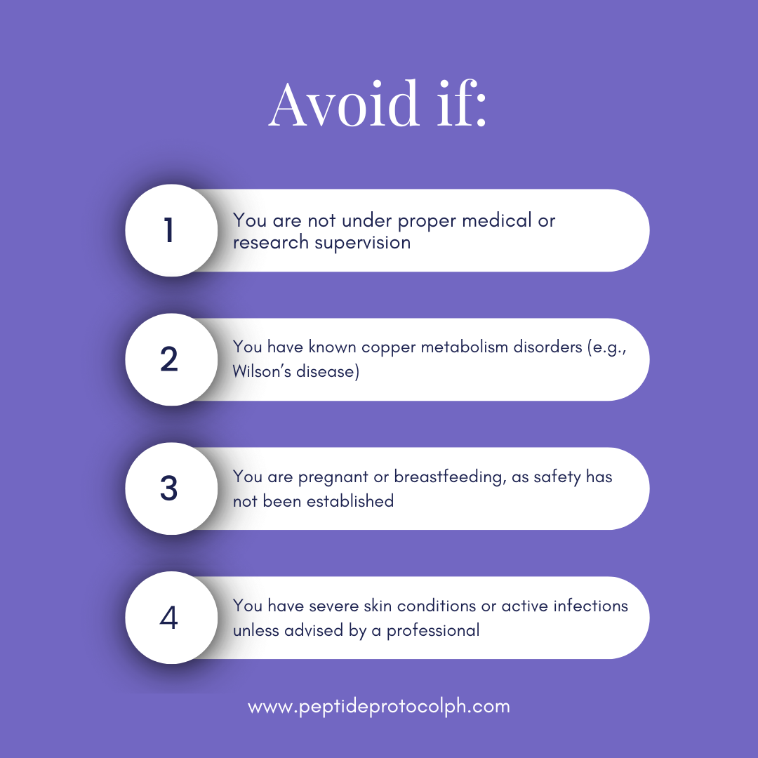Copper peptides are powerful, but not for everyone. If you have metal allergies, uncontrolled health conditions, or are pregnant or breastfeeding, this compound may not be right for you. Because it’s still under investigation, responsible use and proper guidance are essential before considering Copper Bloom.