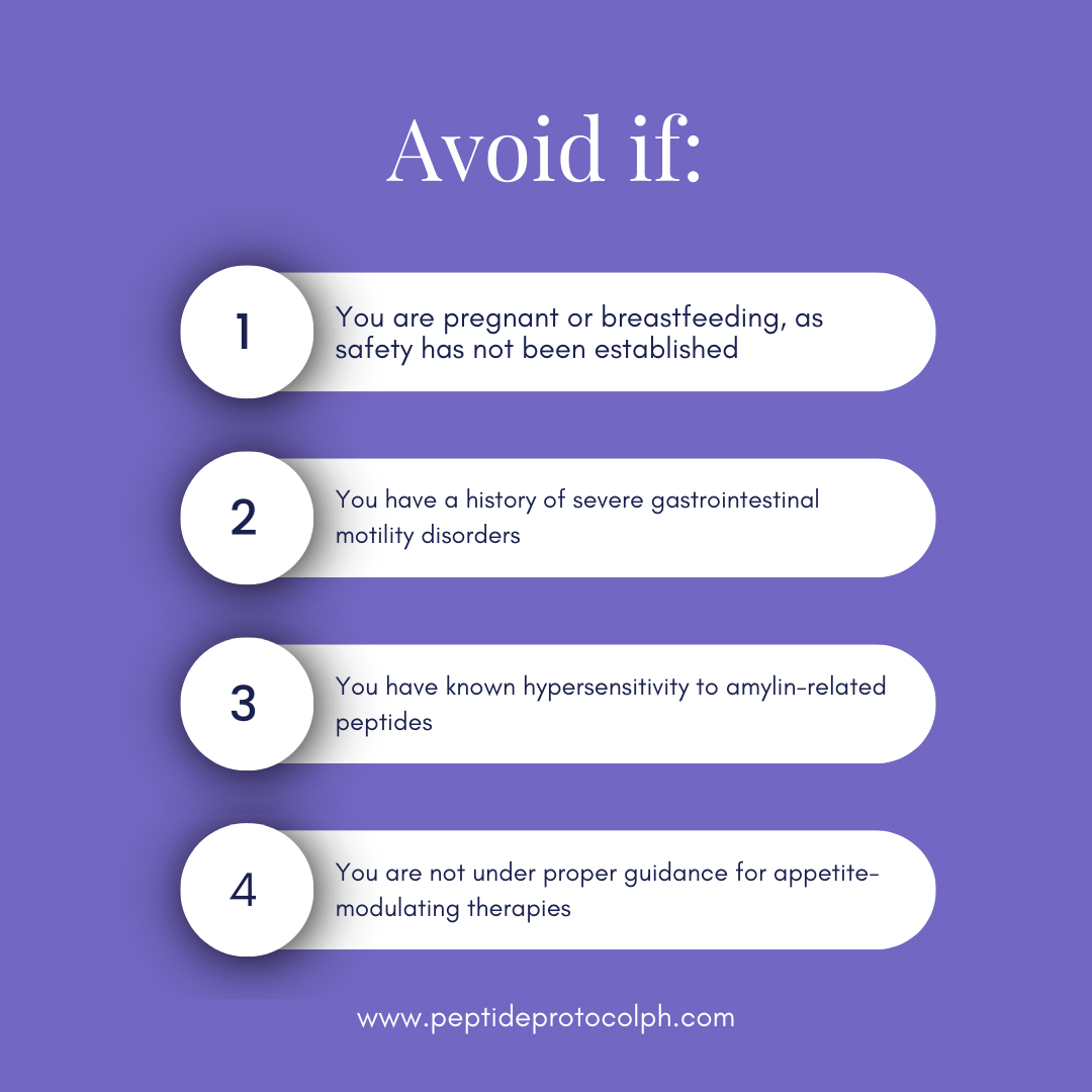 Avoid use if you are pregnant, breastfeeding, or have severe gastrointestinal conditions without medical supervision. As an investigational peptide affecting appetite regulation, Crave Control should be used responsibly and under proper guidance.