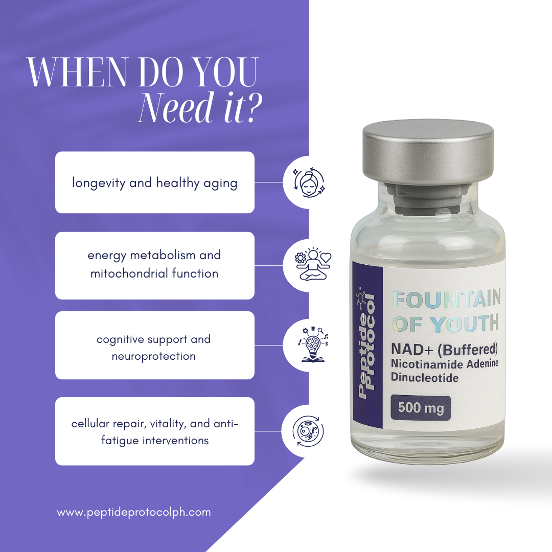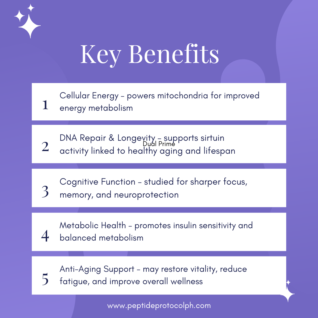 Fountain of Youth is studied for benefits like sharper focus, improved energy, better metabolic function, and enhanced resilience against aging stress. Many also explore it for healthier skin, muscle recovery, and deeper sleep. Unlike stimulants, NAD+ works at the root — your cells — to recharge your system naturally.