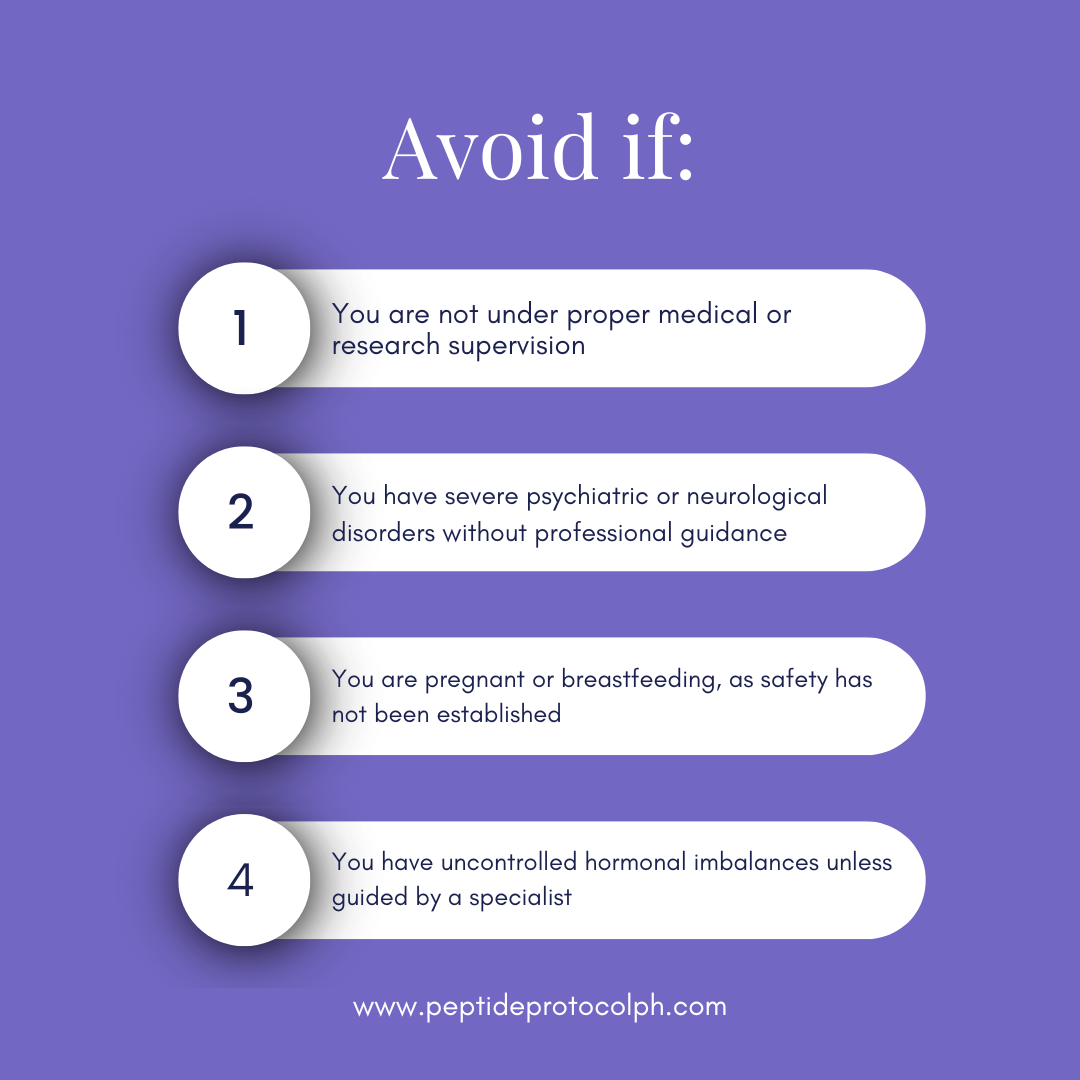 Avoid use if you are pregnant, breastfeeding, have uncontrolled neurological conditions, or are taking sedative medications without medical supervision. DSIP is still under study, and while promising, it should be approached with care and guidance